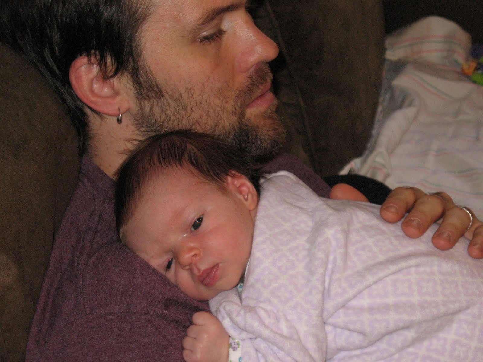 Watching a brand new person all day every day is quite a new experience. I get to track the littlest changes in her development, the tiny little things that will eventually lead to a walking and talking child. But not yet! So far, Zoe can do exciting, life changing things, like lift her own head up off of your shoulder (she especially likes to do this when you are burping her, so that she is away from the spit cloth and over your neck), and kick her feet like crazy (which Aaron uses to help her kick on her socks or pant legs). And we are learning more about her likes and dislikes: